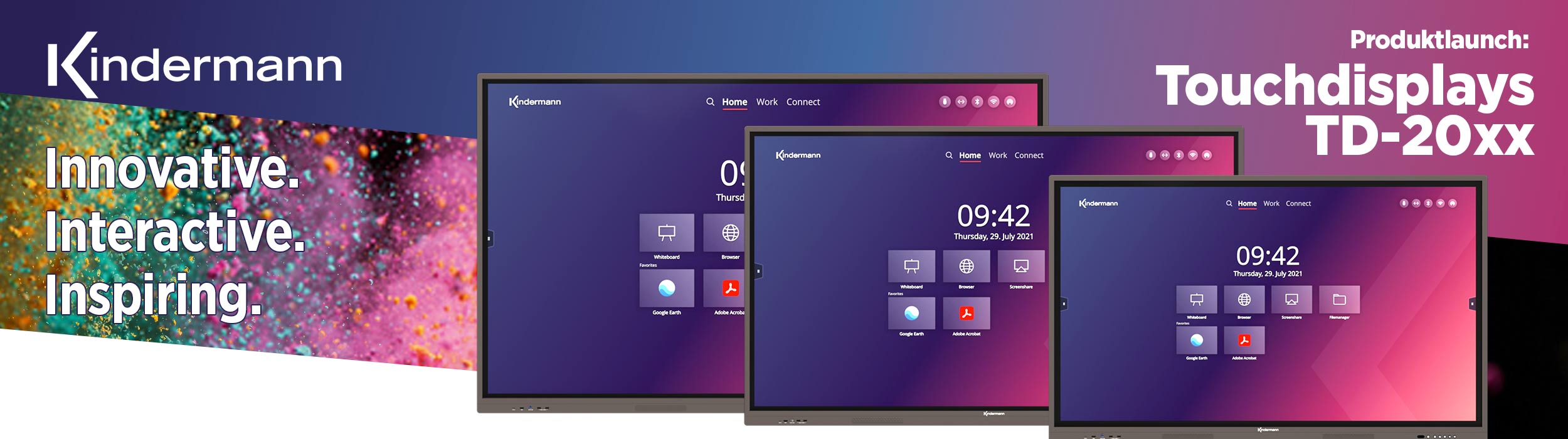 Präsentation, Zusammenarbeit, Austausch. Die Displayserie von Kindermann mit ihrer eigenentwickelten, intuitiven Benutzeroberfläche ist erste Wahl für den Einsatz in Unternehmen und im Schulwesen mit einem herausragenden Preis-Leistungs-Verhältnis.