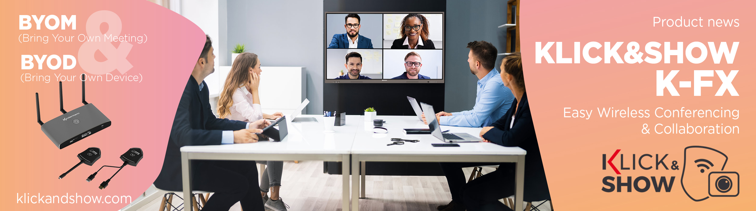 KLICK&SHOW K-FX verwandelt konventionelle Konferenzräume in hybride Besprechungsräume und erleichtert so die Zusammenarbeit zwischen Büro und Homeoffice. Es verbindet Ihr Notebook kabellos mit dem Display und der professionellen USB-Kamera- und -Audiolösung im Raum